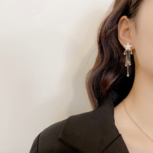 925 Silver Needle Star and Moon Asymmetric Tassel Earrings