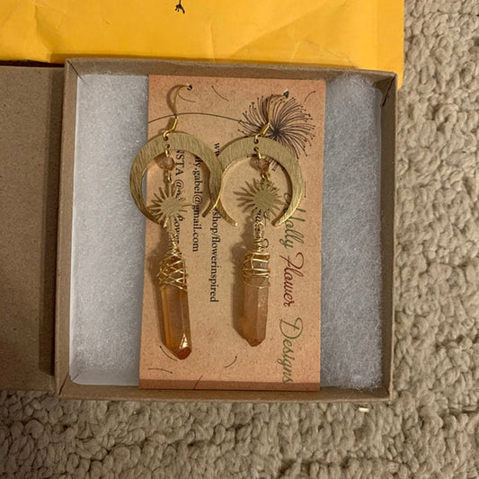 Gold Moth And Quartz Hanging Ear Earrings Celestial Moonstone